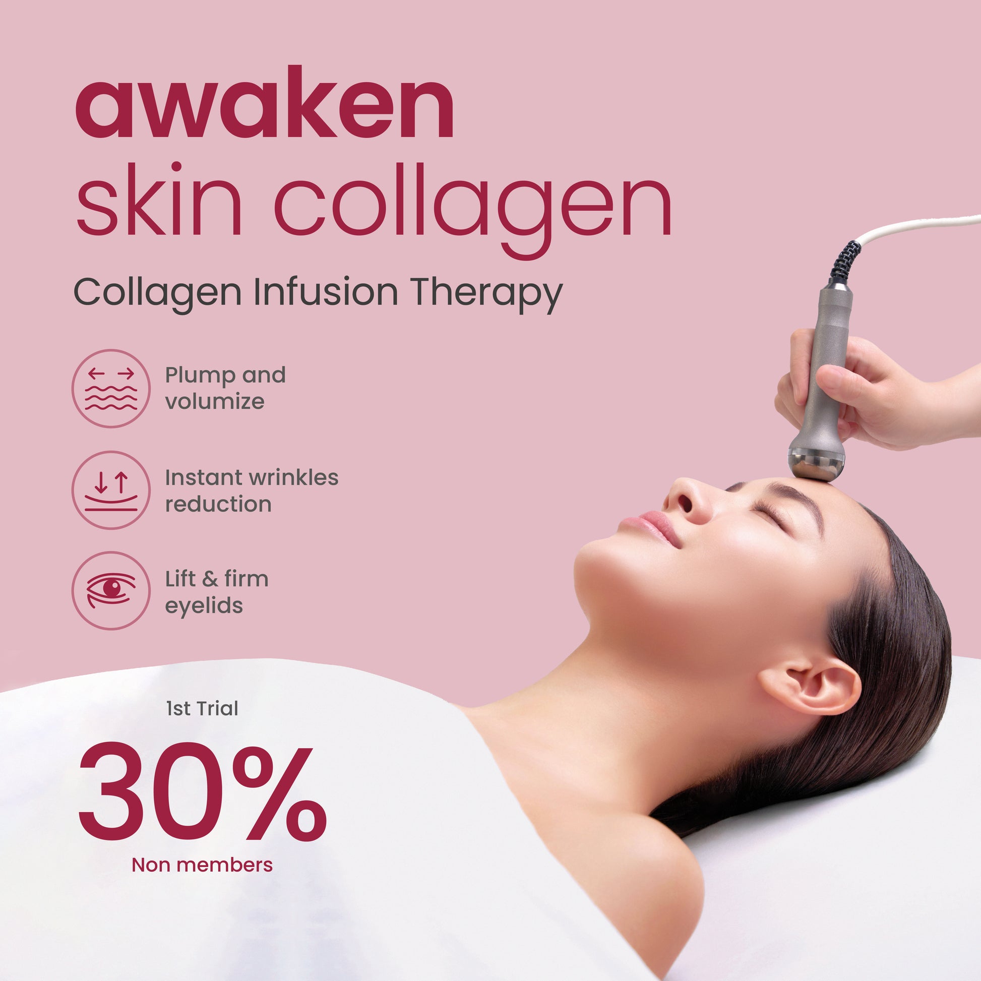 Introducing Collagen Infusion Therapy,, targeting both the complexion and the wrinkle-prone eye area, our latest firming facial treatment features an advanced anti-ageing combination of antioxidative marine collagen and an ultrasound machine coupled with a customised facial massage to stimulate your skin’s natural collagen and elastin production for a lasting youthful visage.
