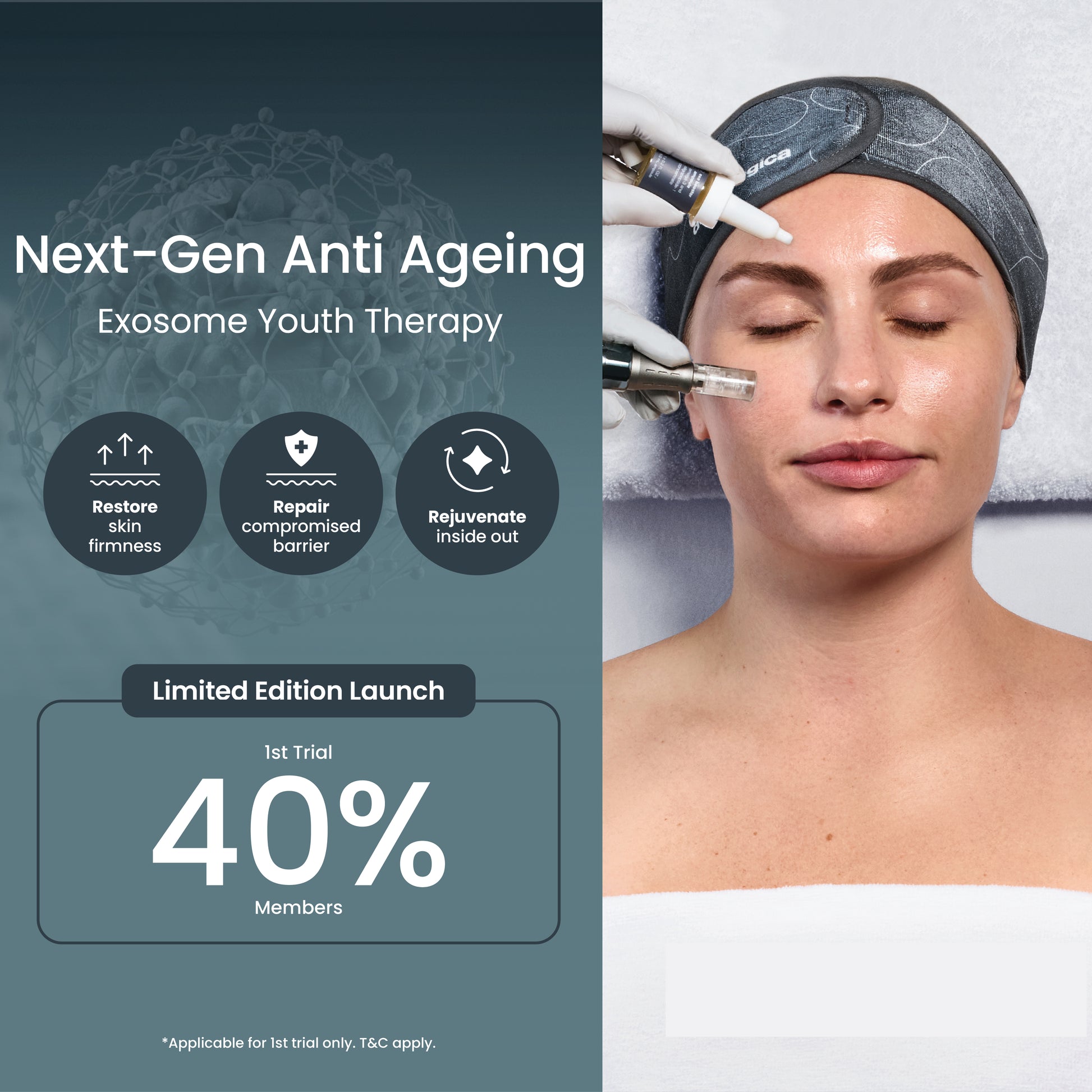 Introducing Exosome Youth Therapy,, targets a compromised skin barrier, loss of firmness, dullness, and uneven skin tone. Our next-gen anti ageing facial treatment powered by exosomes to repair compromised skin barrier, restore skin firmness, and rejuvenate the skin from inside out.